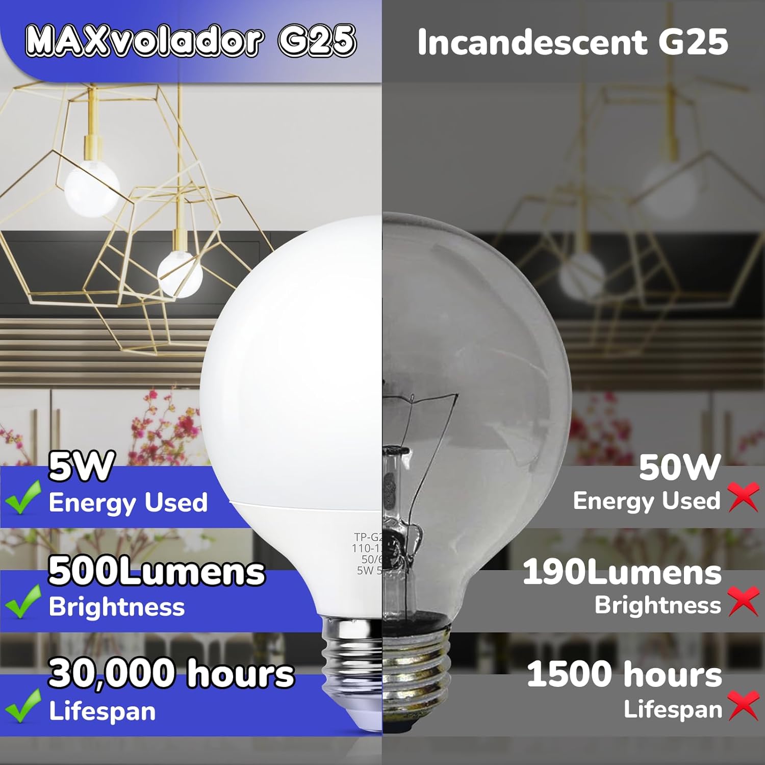 Globe Light Bulbs Daylight White Lighting 5000K: G25 led light bulbs simulate bright morning sunlight, providing elegant and clear lighting that helps you save time on your daily makeup routine. These globe vanity light bulbs with vivid and bright lighting are the perfect choice for replacing bathroom or makeup mirror bulbs