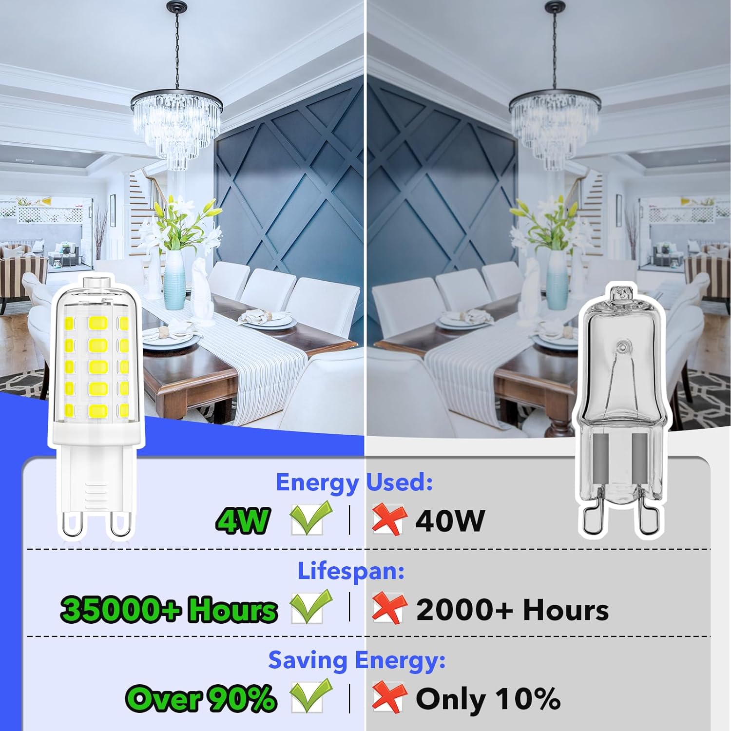 Long Lifespan & Energy Efficiency: The g9 bulb offers the same brightness as a 40watt halogen bulb while requiring only 4 watts of power and saving over 90% on energy costs. Each g9 led bulb dimmable has a lifespan of 35,000 hours, greatly minimizing the need for frequent replacements