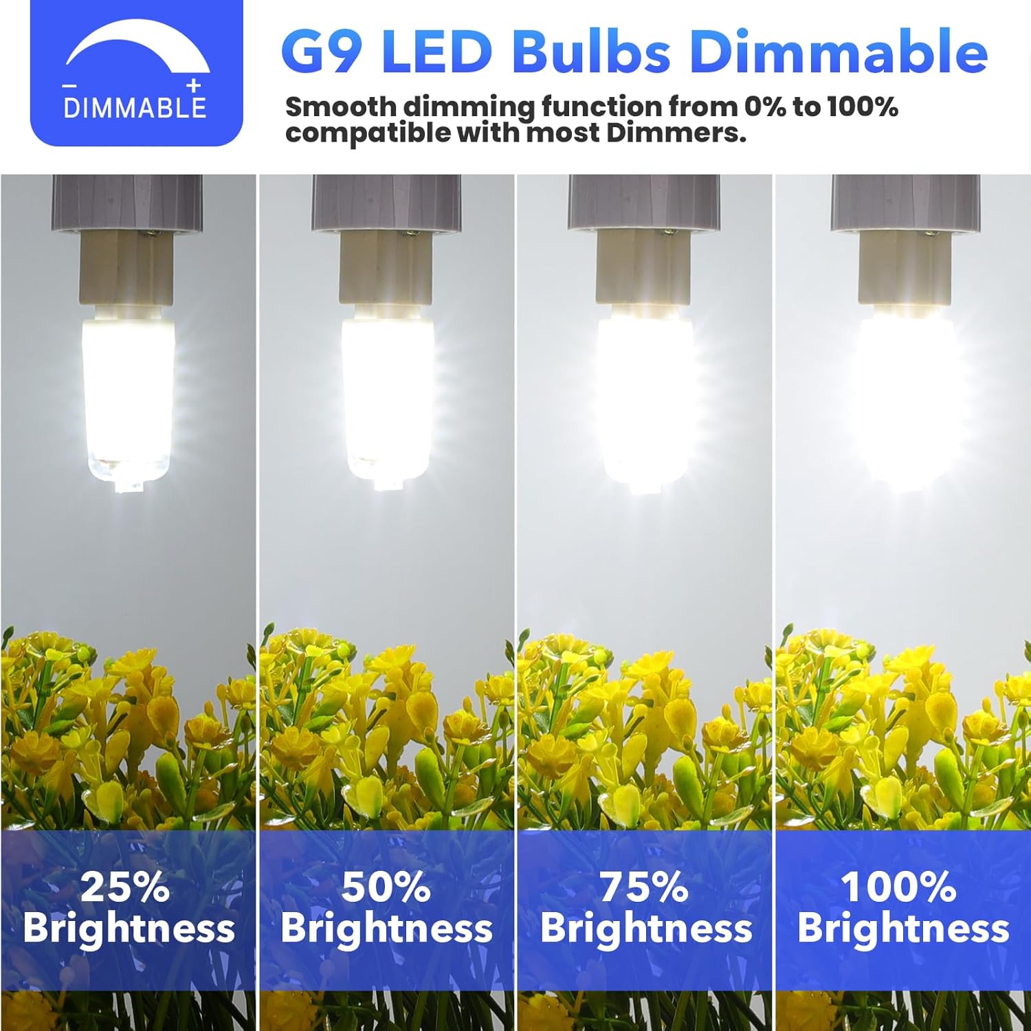 High Heat Dissipation & No-Flicker: The dimmable g9 light bulbs use advanced fire-resistant ceramic materials to ensure high heat resistance and dissipation for indoor safety use. With stable electronic components, the led light bulbs offer flicker-free, glare-free lighting with no buzzing sounds
